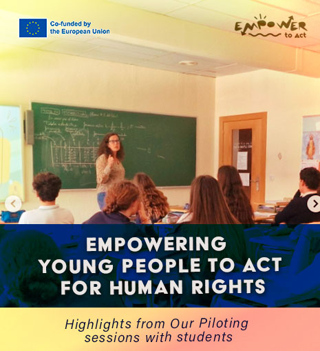 Empower2Act project aims to promote a culture of human rights protection, encouraging students to advocate for human rights and become activists. The project fosters the engagement of teachers and students in the process of design and implementation of raise awareness campaigns addressing local issues concerning human rights, involving the local communities in the process. The project aims to encourage young students to take an active role in their communities, with regards to Human rights, while boosting their civic engagement. The project aims to promote Human rights education (HRE) for teachers and school students aged 14-17, and also to empower them to become advocates for human rights.